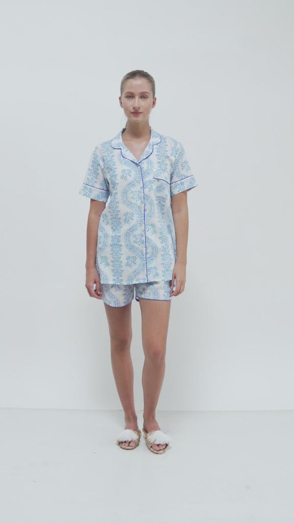 Su diseño incluye blusa de manga corta con cuello camisero y botones al frente, y un short con pretina elástica ajustable que asegura el confort durante toda la noche. El estampado floral en tonos azules le da un toque romántico y sofisticado, perfecto para tus momentos de descanso.