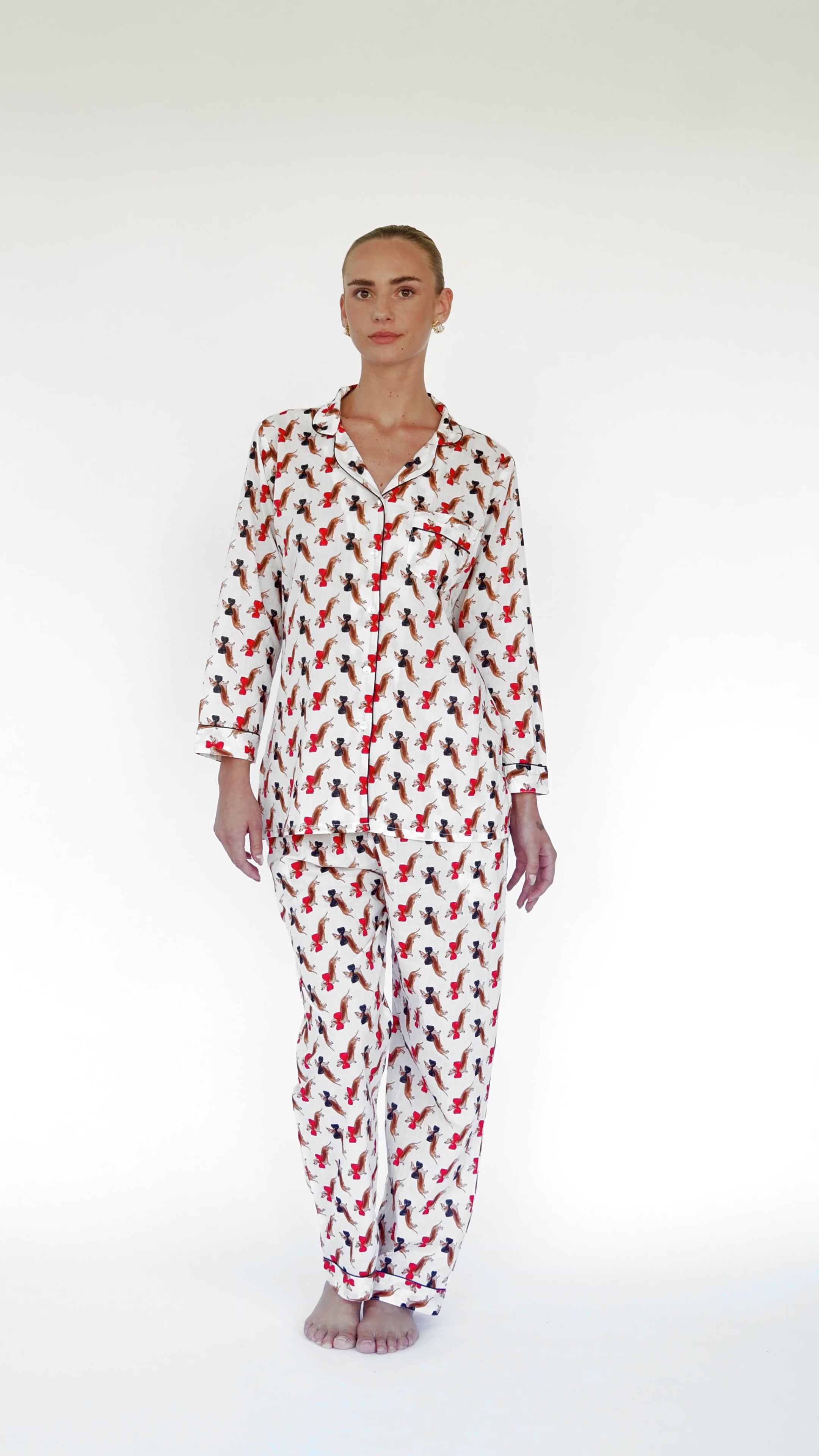 Indulge in luxurious comfort and style with PIJAMA PAWS. Crafted from 100% cotton, this beautiful black and red printed pajama features charming dogs on a crisp white background. Stay cool and fashionable in this must-have piece.